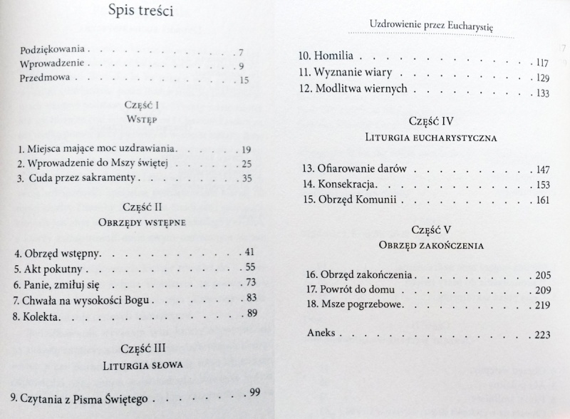 Uzdrowienie przez Eucharystię to książka, którą świetnie się czyta, bogata w informacje, napisana przez kapłana o ponad dwudziestoletnim doświadczeniu w służbie modlitwy o uzdrowienie fizyczne i duchowe. Uczestnictwo w Mszy św. może stać się zupełnie nowym przeżyciem dla osób, które przyjmą na poważnie przesłanie tej niezwykłej książki. Biskup Paul V. Dudley: Przez wiele lat żywiłem przekonanie, że daleko zbyt małą wagę przywiązuje się do cudownej, uzdrawiającej mocy naszego Pana Jezusa Chrystusa, która objawia się w świętej Ofierze Mszy. Mam ogromne przeświadczenie, że ta znakomita książka – Uzdrowienie przez Eucharystię – będzie wielką pomocą dla Was i Waszych bliskich. Książki tej nie wystarczy po prostu przeczytać – powinna stać się niewyczerpanym źródłem medytacji w przygotowaniu do pełnego uczestnictwa w Eucharystii.